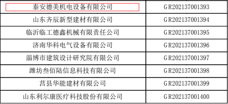 泰安德美機電設(shè)備有限公司成功入選“山東省2021年認定的diyi批企業(yè)”。