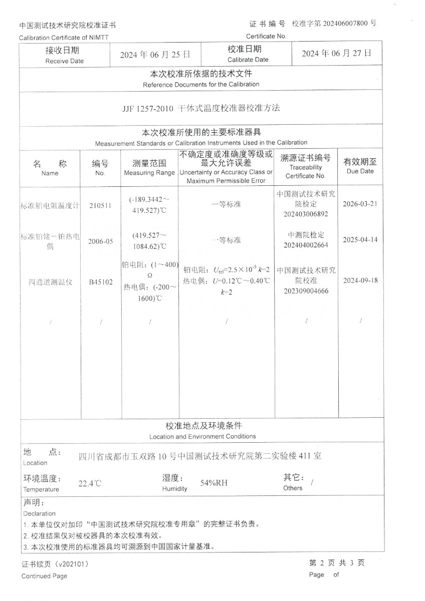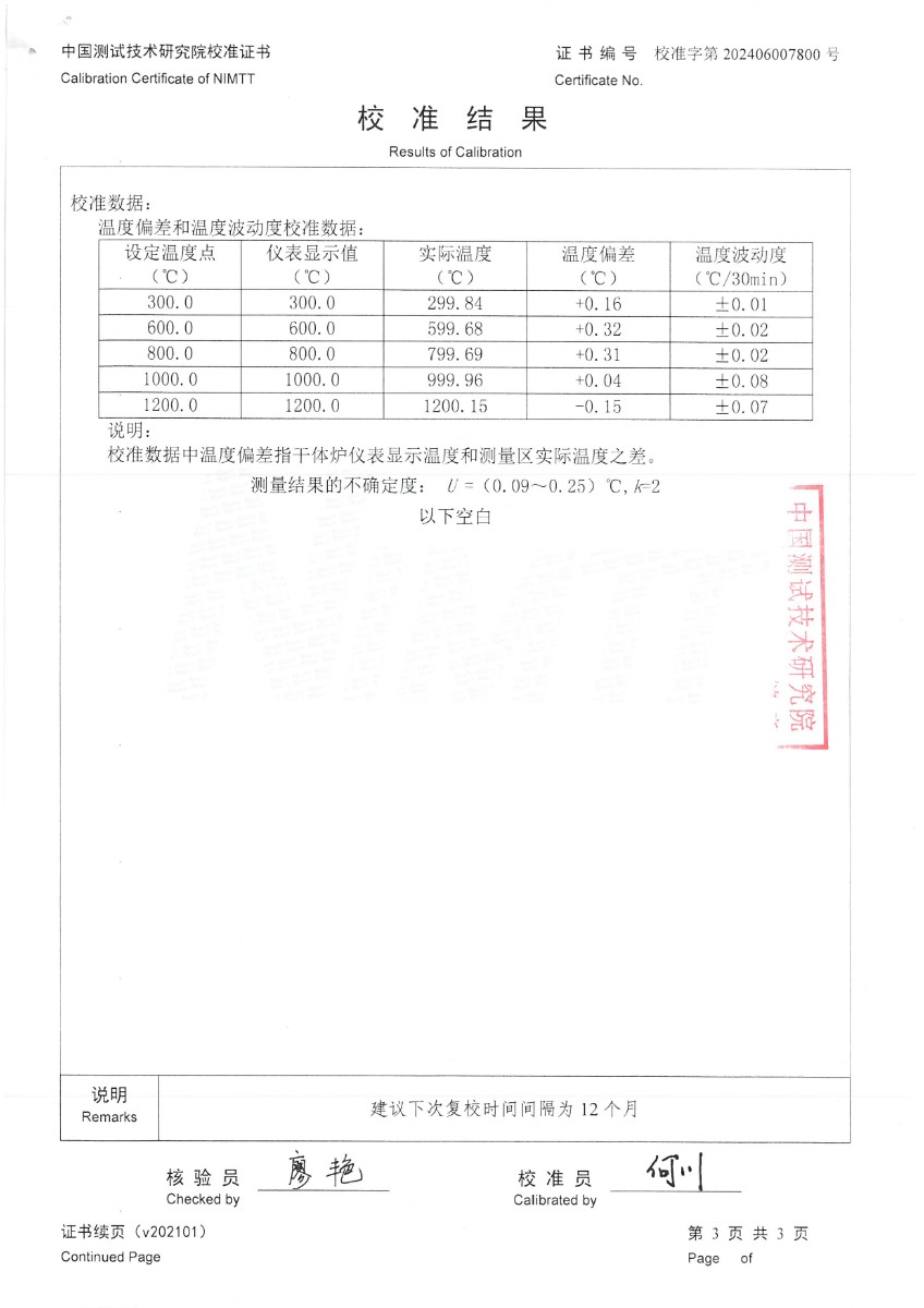 高溫干體爐(300~1200℃)校準證書 2024-7-1 本文被閱讀 6030 次