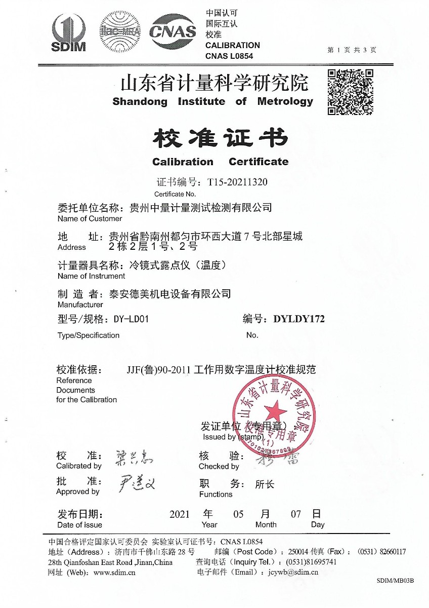 貴州中量計量測試檢測有限公司-冷鏡式露點儀校準證書 2021-5-15 本文被閱讀 15236 次