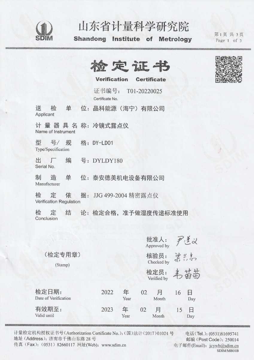 | 上一條:晶科能源(海寧)有限公司-冷鏡式露點(diǎn)儀(溫度)校準(zhǔn)證書(shū) | 下一條:冷鏡式露點(diǎn)儀校準(zhǔn)證書(shū) |